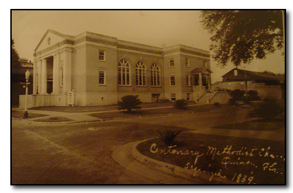 City authorities once again condemned the church building in the year 1916, so the membership was challenged to build a bigger and better one. The first church used by the Methodists was a wooden building; the second, brick stuccoed in white; the third, red brick. The year was 1917 when work began on the fourth Methodist Church and the third on the present site. This building was cream brick with white stuccoed trimmings. Two large white Doric columns graced the front entrance. Hal Hentz of Atlanta was the architect and J. P. Haigler, the builder. Due to the World War, financial plans for the church were not carried out much to the disappointment of Mr. Hentz and the congregation. The beautiful memorial windows and pews from the Gothic structure were used. However, no place was made for the old bell as in the two previous buildings. This brought sadness to the group of Methodists. While the church was being built services were held in the Court House. The building was completed in 1918 and a Pilcher pipe organ was installed, the first pipe organ to be placed in a Quincy church. ORGAN The Organ was designed and built by the Schlicker Organ Company, Buffalo, N.Y. in consultation with Doctor V. Earle Copes and Mrs. E. B. Shelfer, Jr. The instrument consists of three divisions, great, swell and Pedal. There are forty stops on the three divisions of the 807 pipe instrument. The organ console is at a lower level facing the choir. In the absence of a choir director the organist can direct the choir from the organ bench.