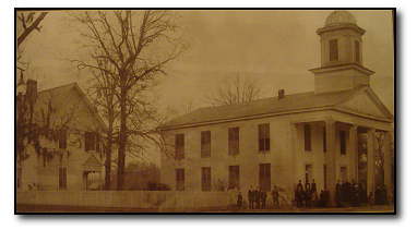 There was a Methodist "Mission" work here in Quincy during the 1820's, but a wooden building known from public records as a "House of Worship for the M in Quincy" was erected during the "thirties." The year 1839 was eventful for the Methodist congregation because a new church was erected on the corner of Madison and Franklin Streets. The lot was given by Joseph McBride, and a church tablet may be viewed today bearing the historical fact. The second church building was a colonial type made of brick and stuccoed with white cement. Green b accentuated the windows at the upstairs and downstairs levels. A steeple housed the bell that is prominently displayed on Madison Street today while a wide porch covered the front supported by colonial columns. A large gallery covered three sides on the interior and Negro worshipers filled these, using a wooden partition down the center aisle to separate the women from the men. The pulpit was high and supported by six stairs on each side while the organ was in the opposite end from the pulpit. The architect and builder was Madison Wilson, described as a "grand and stalwart man among pioneers."