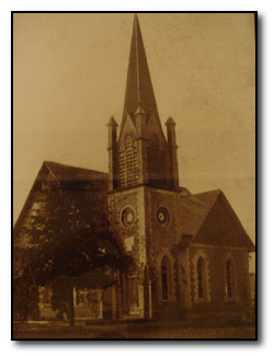 In 1895 the church was condemned when a defect was discovered in the south wall. The second story was sawed off and a one story structure replaced it in 1896. It was red brick and constructed along Gothic lines. An unusually tall steeple contained the "old bell." For the first time stained memorial glass was introduced to the building.
