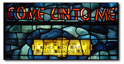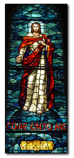 The "Come Unto Me" window is executed almost entirely in varying shades of blue with the exception of the red in the banner and Christ's robe.