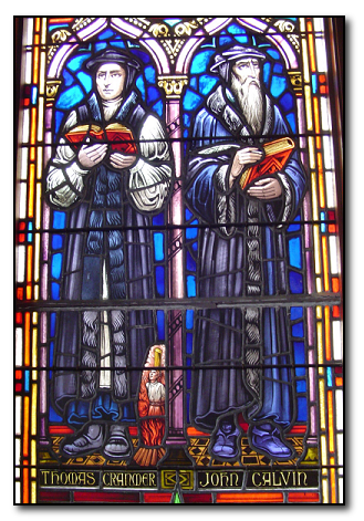 Mary I of England had Cranmer burned at the stake for his religious belief. The inset in the window depicts his martyrdom.