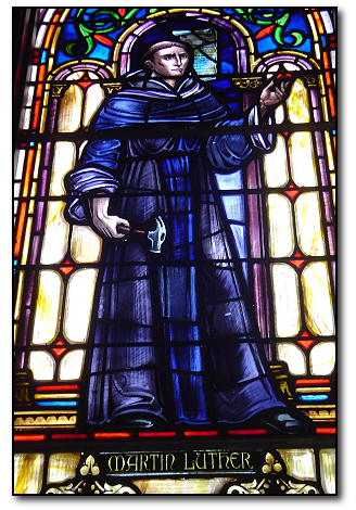 Martin Luther (1483-1546) is shown in his humble monk's robe as he has finished nailing the "Ninety-five Theses" to the door of the church in Wittenberg in 1517.